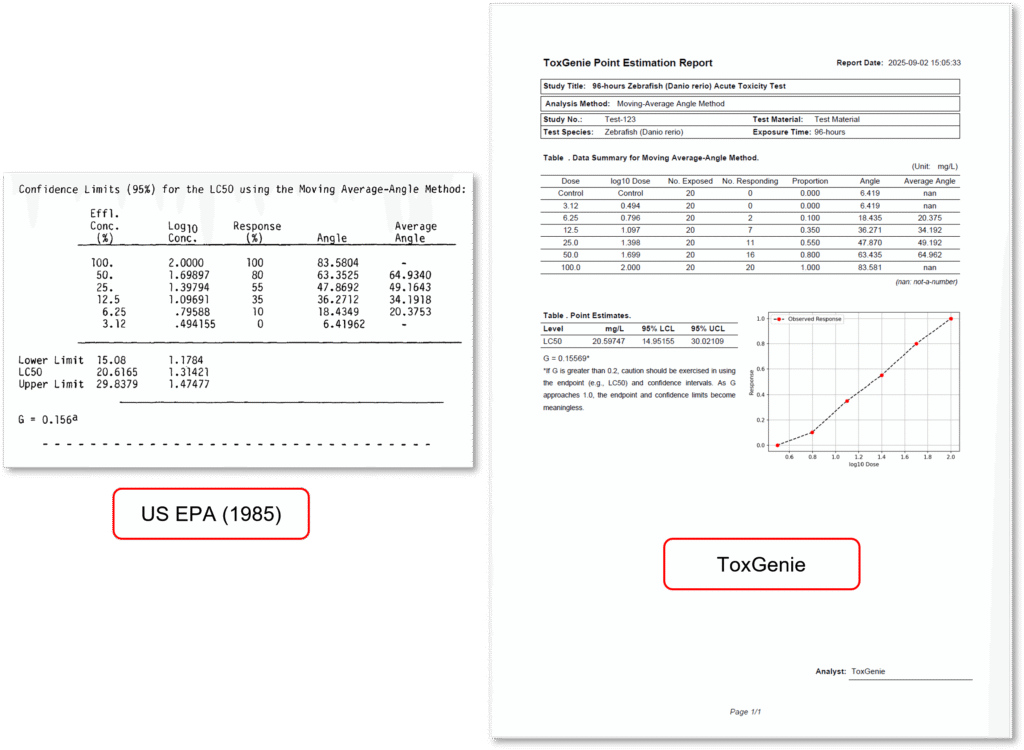 To compare ToxGenie’s analysis results, the Moving Average Angle Methods were applied using the same data as in the US EPA Report (EPA 600/4-85-013, 3rd edition, 1985). The results are shown in the figure above.